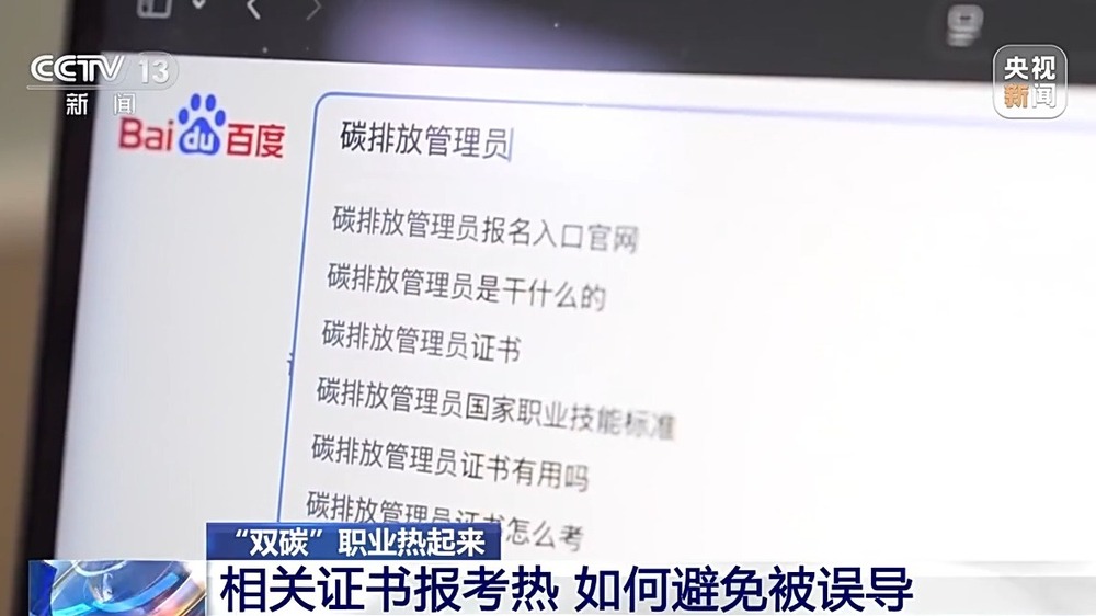 记者在浏览器中输入碳排放管理员时,与“职业资格证”“证书怎么考”相关的词条便立刻跳了出来,记者翻阅后发现,相关证书被包装成了“职业资格证书”,负责人承诺现在报考是很好过的,并且从事该方面的职业不能没有此类证书。